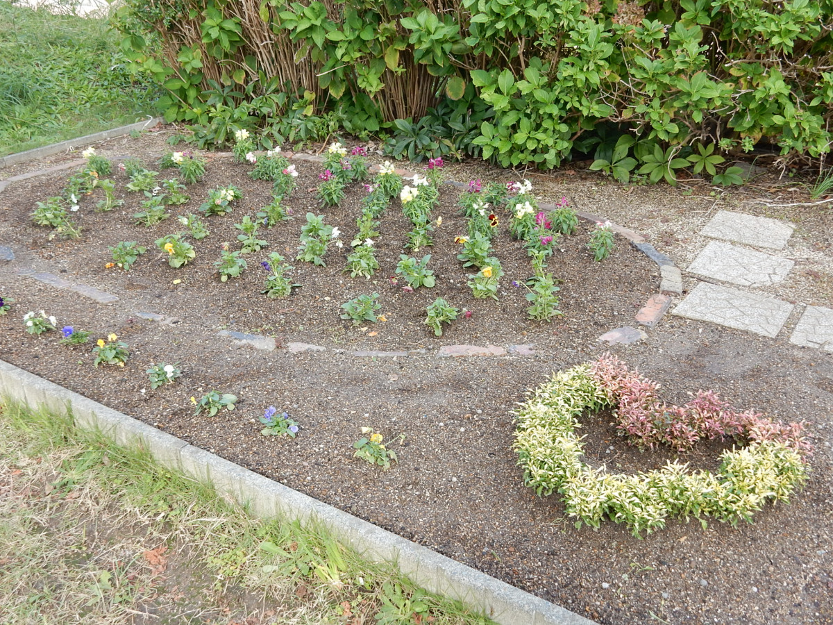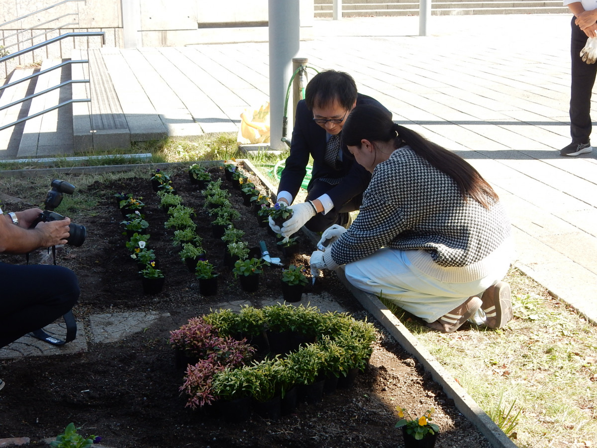 花壇にはパンジー、ビオラ、アリッサム、キンギョソウ、ナデシコ、アキランサスなど、色とりどりの花苗を並べ、参加者全員で心を込め丁寧に植えました。