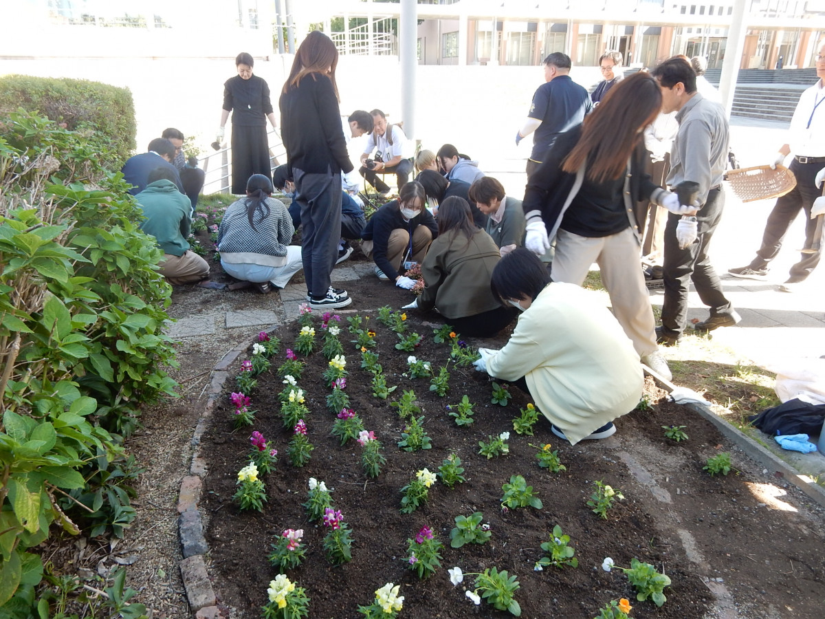 令和7年10月24日(金)の昼、浜田キャンパスの平岡都さん記念花壇「Garden of Hope」に、学生や教職員が集まり、秋の花苗の植替え作業を行いました。