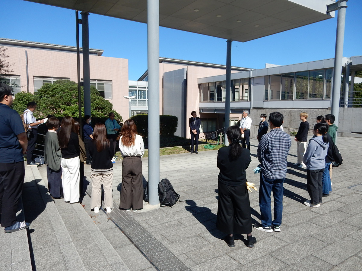 お手入れに先立ち、林副学長よりご挨拶があり、参加者全員で平岡さんへの追悼の意を込めて、静かに黙祷を捧げました。