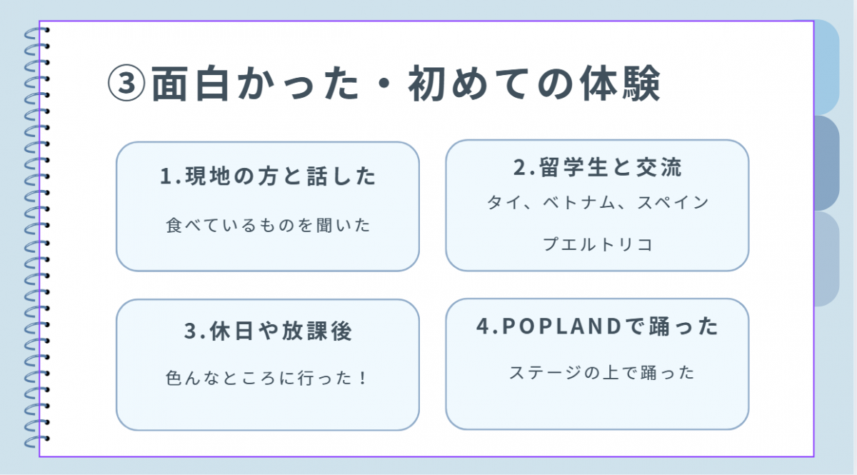 研修先での授業、生活の様子、印象に残ったこと、現地の方の交流についてなど、写真や動画を使いながら、非常に幅広い視点で発表をしていただき、参加者からもユニークな質問が挙がっていたことがとても印象的でした。