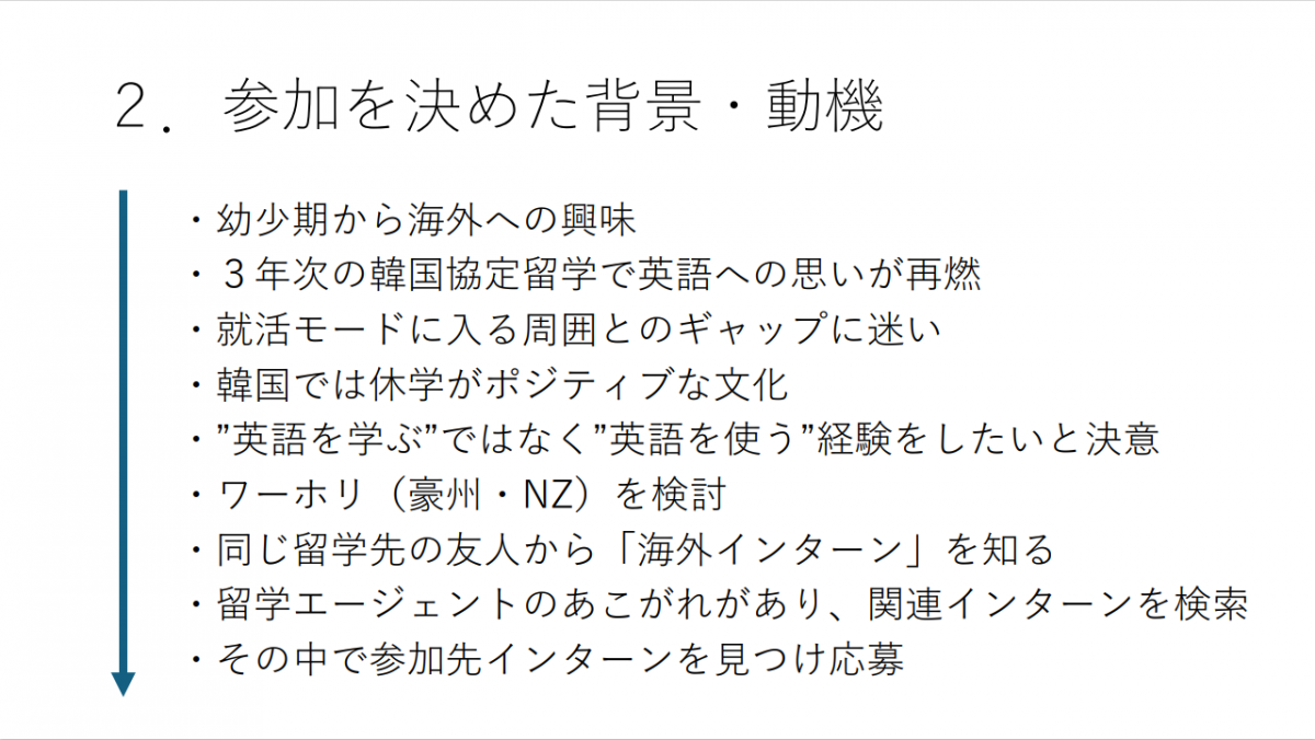 本学の留学・研修制度は利用せず、自分で目的や行先を決めて、海外で様々な活動に取り組んだ学生が、それぞれ体験報告をしてくれました。