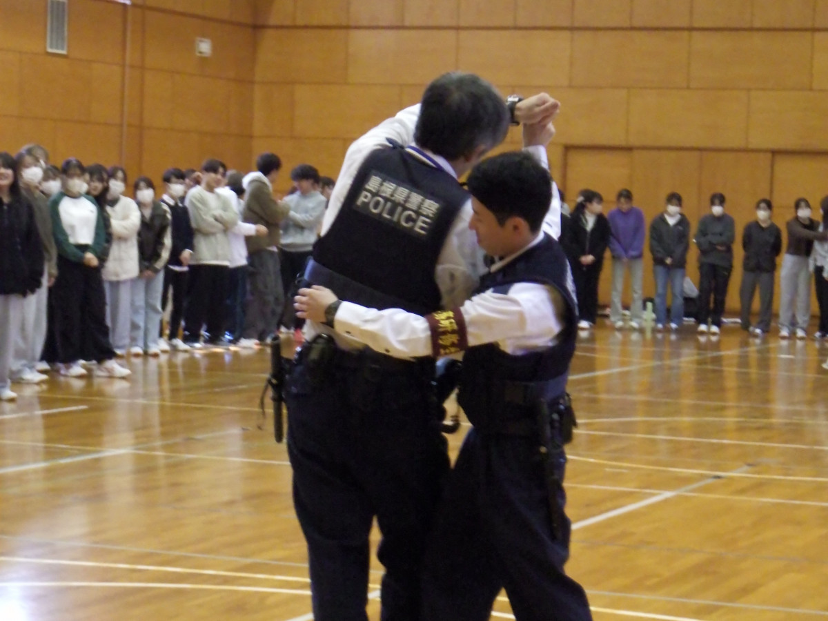 出雲警察署、かわと交番から4名の警察官の方にお越しいただき、特殊詐欺被害や闇バイト、出雲で実際にあった事案などについてお話しいただき、その後、護身術の実技指導をしていただきました。