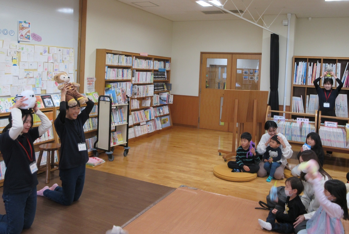 大型絵本や手話絵本などを一緒に楽しみ、手遊び「さよならあんころもち」では、ぬいぐるみたちに作ったあんころもちを「はいどーぞ」!