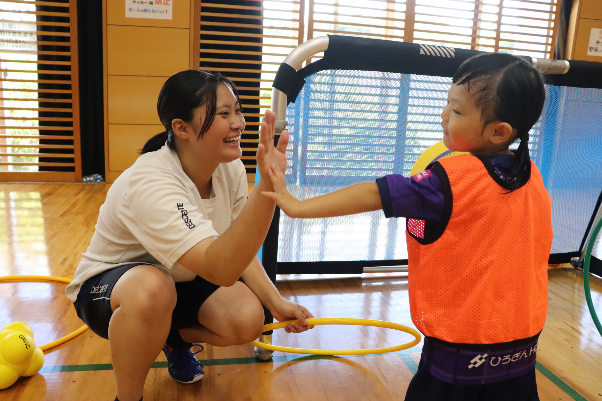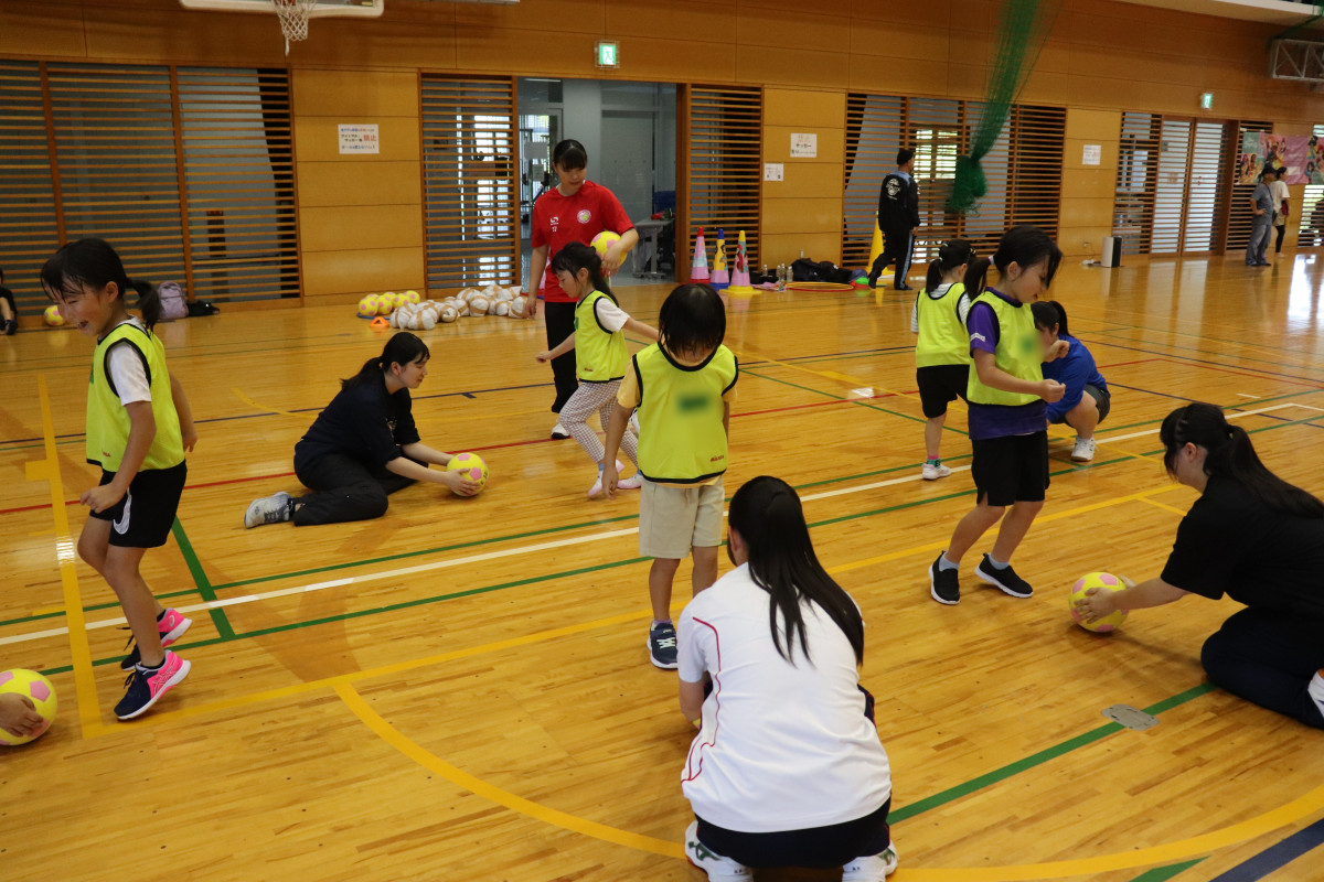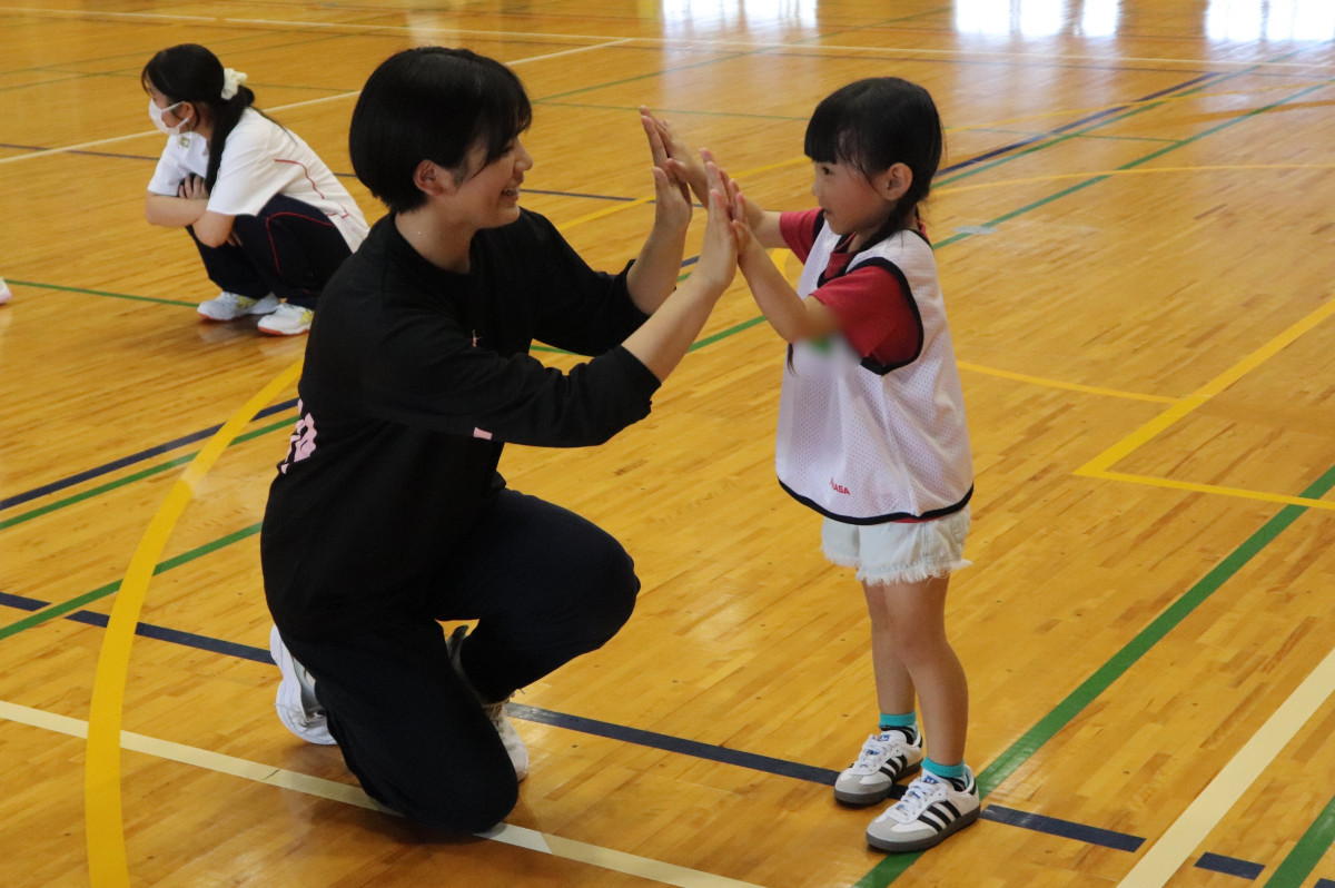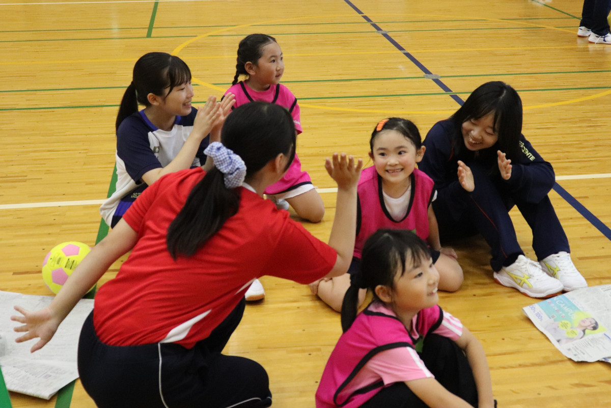 "笑顔とハイタッチ"をキャッチフレーズとして開催している”なでしこひろば”の活動を通して、運動好きな子どもと、運動指導の得意な学生を沢山増やし、地域に貢献したいと考えています。また、今年度の重点テーマとして”コミュニケーション:対話”をキーワードとして、ただ運動の指導をするだけでなく、”子どもの主体性を育む運動指導”をテーマに、子どもとの対話を大切にしながら実施しています。