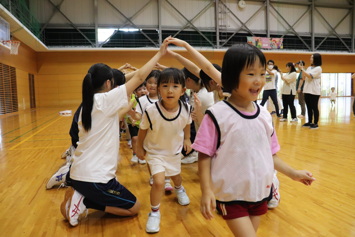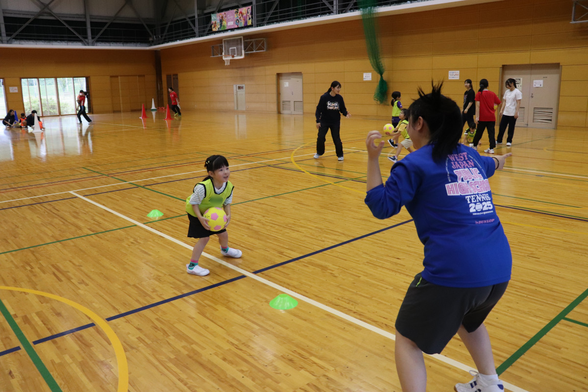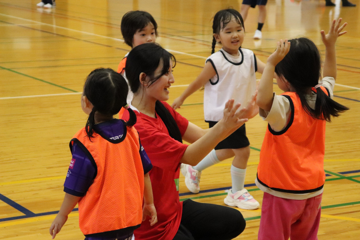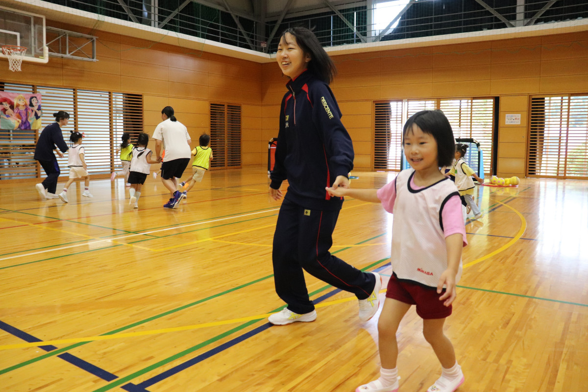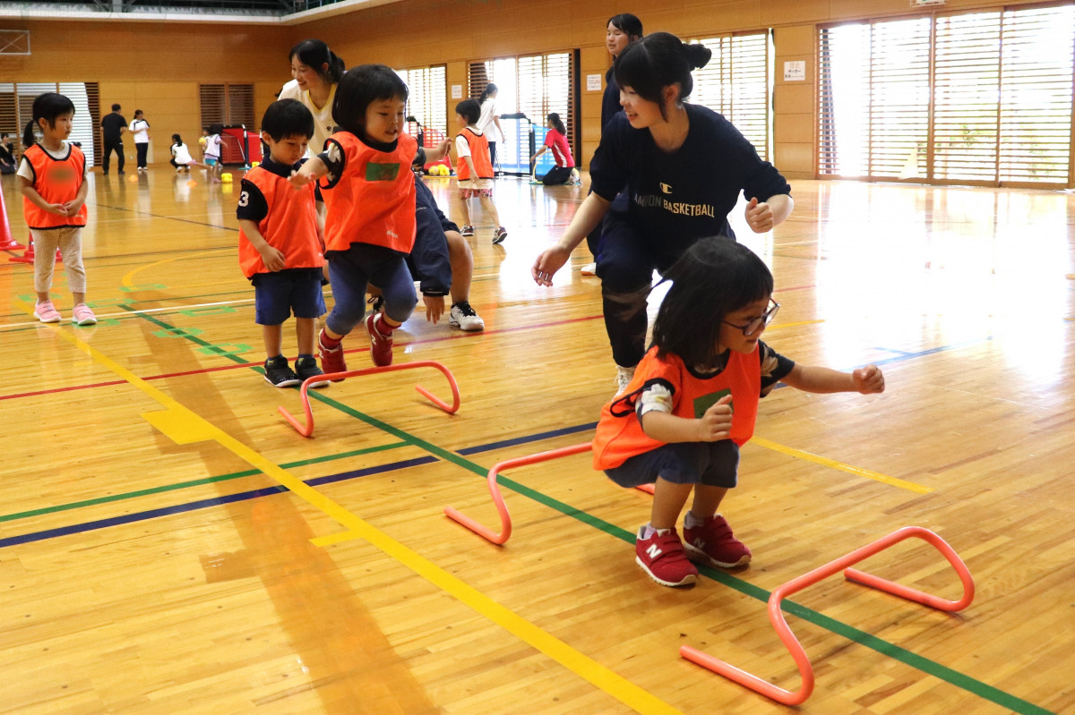 "笑顔とハイタッチ"をキャッチフレーズとして開催している”なでしこひろば”の活動を通して、運動好きな子どもと、運動指導の得意な学生を沢山増やし、地域に貢献したいと考えています。また、今年度の重点テーマとして”コミュニケーション:対話”をキーワードとして、ただ運動の指導をするだけでなく、”子どもの主体性を育む運動指導”をテーマに、子どもとの対話を大切にしながら実施しています。