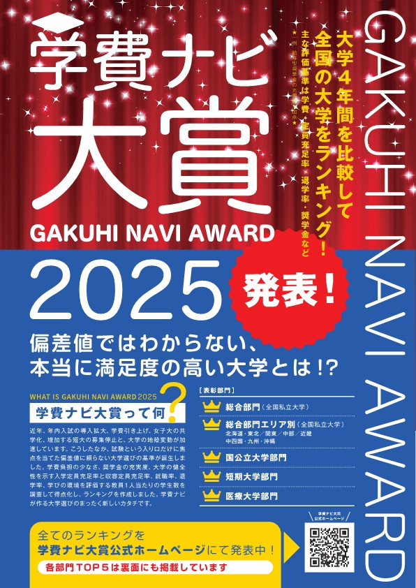 学費ナビ大賞(運営:株式会社アイガー)は、学費負担の少なさ、奨学金の充実度、大学の健全性を示す入学定員充足率と収容定員充足率、就職率、退学率、学びの環境を評価する教員1人あたりの学生数を調査して、教育・経営の両面で高い成果を上げた大学・短期大学を総合的に評価し、顕彰したものです。