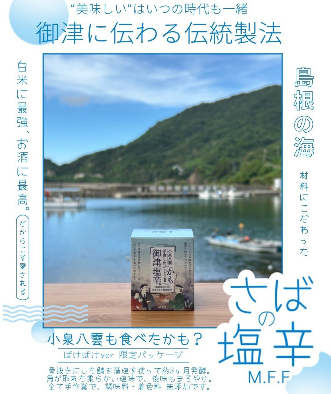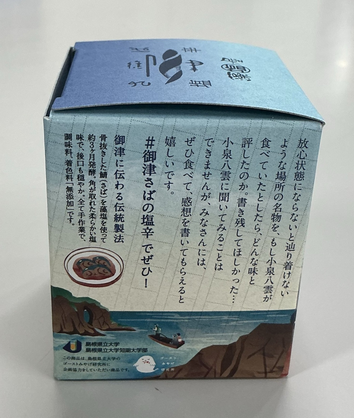 この度、島根県立大学松江キャンパスゴーストみやげ研究所サークルでは、株式会社Mitsu Fisherman's Factory(以下、M.F.F.)さんが製造している「鯖の塩辛」とのコラボパッケージを制作に携わりました!