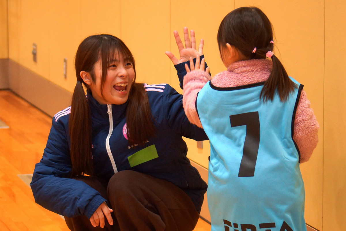 "笑顔とハイタッチ"をキャッチフレーズとして開催している”なでしこひろば”の活動を通して、運動好きな子どもと、運動指導の得意な学生を沢山増やし、地域に貢献したいと考えています。また、今年度の重点テーマとして”コミュニケーション:対話”をキーワードとして、ただ運動の指導をするだけでなく、”子どもの主体性を育む運動指導”をテーマに、子どもとの対話を大切にしながら実施しています。