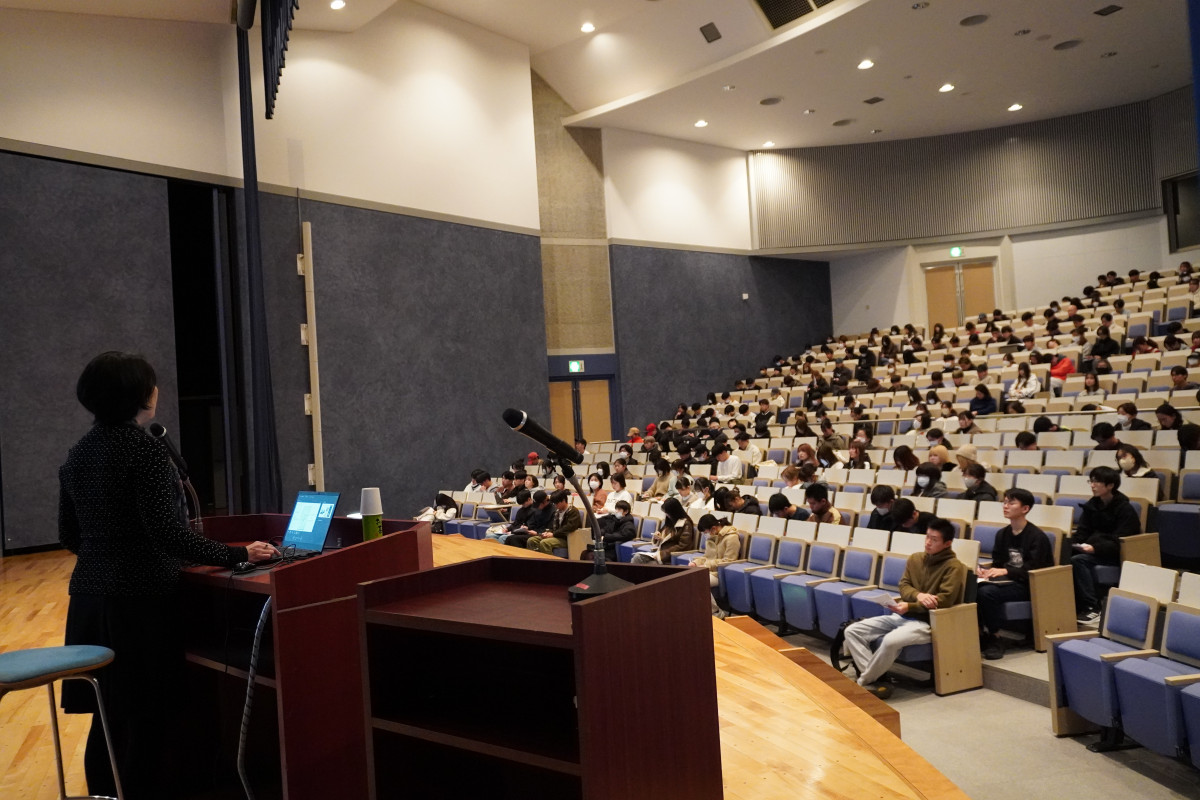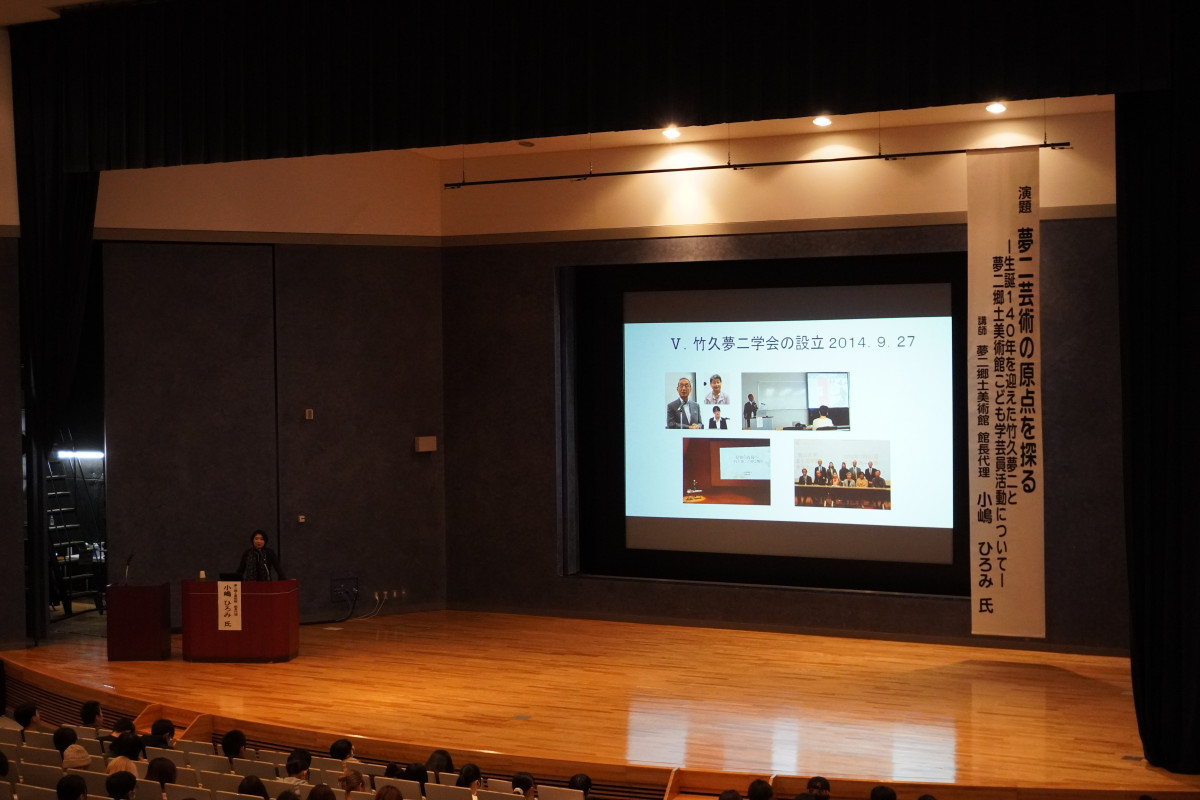 12月5日(金)に夢二郷土美術館 館長代理の小嶋ひろみさんをお迎えし、「夢二芸術の原点を探るー生誕140年を迎えた竹久夢二と夢二郷土美術館こども学芸員活動についてー」をテーマに講演会を開催しました。一般・学生合わせて約400人が聴講しました。聴講した学生からは、「夢二さんのマルチな才能に圧倒されました。1つの職にこだわらず自身の関心の向くままに才能を発揮したからこそ、後世に語り継がれる芸術を多く残したのだと思いました」などの感想が寄せられました。