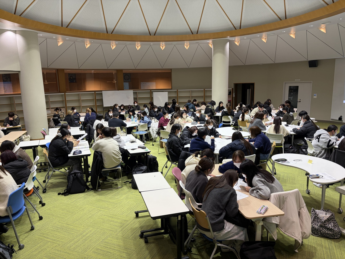模擬患者の協力を得て、臨床の看護場面に近い環境を模したシミュレーション演習を行っています。基礎看護学実習Ⅱ(病院)に向けた準備として、看護の知識・技術・態度を総合的に学ぶことを目的としています。